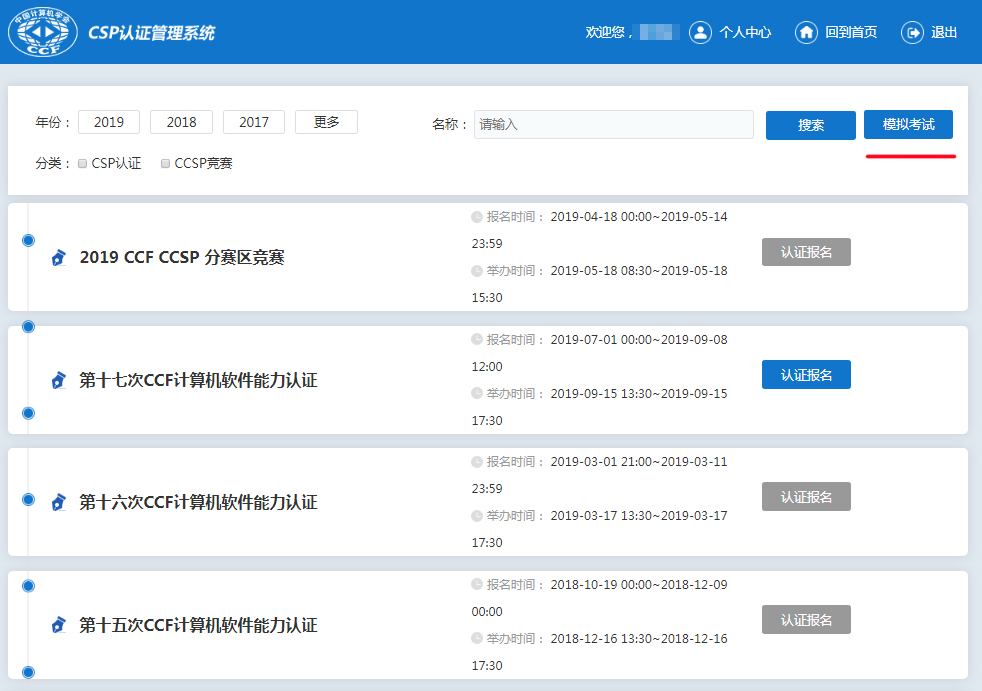 为了让参加认证者熟悉认证操作环境,减少操作失误导致的失分,认证网站提供模拟练习环境,注册后即可练习。同学们可以做历届真题,操作步骤:注册账号登录后点击“报名认证”→“个人中心”→“模拟考试”,看到试题清单列表后,点击“查看试题/答案”,将编写好的代码复制到答题栏的答案程序中即可。系统支持在线评测。