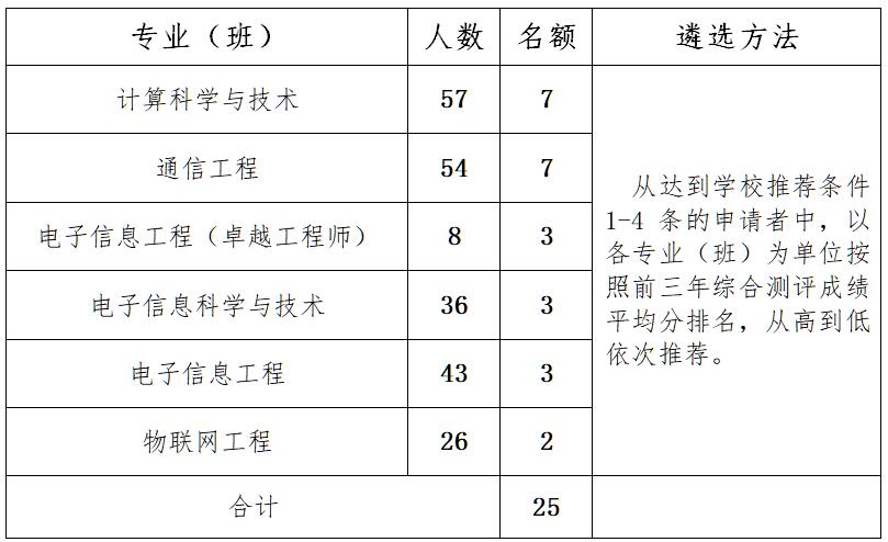 按学校通知,2021年学校分配给yl6809永利官网的推免生名额合计为25名。根据学校名额分配政策,电子信息工程(卓越工程师)免推名额按学生人数35%分配,其他专业基本分配比例为8%,计算机科学与技术、通信工程两个国家一流专业建设点在基本分配比例的基础上增加4%的分配比例,具体名额分配及遴选方法如下表所列,其中各专业(班)人数以2020年9月20日学校教务系统提供的数据为准。