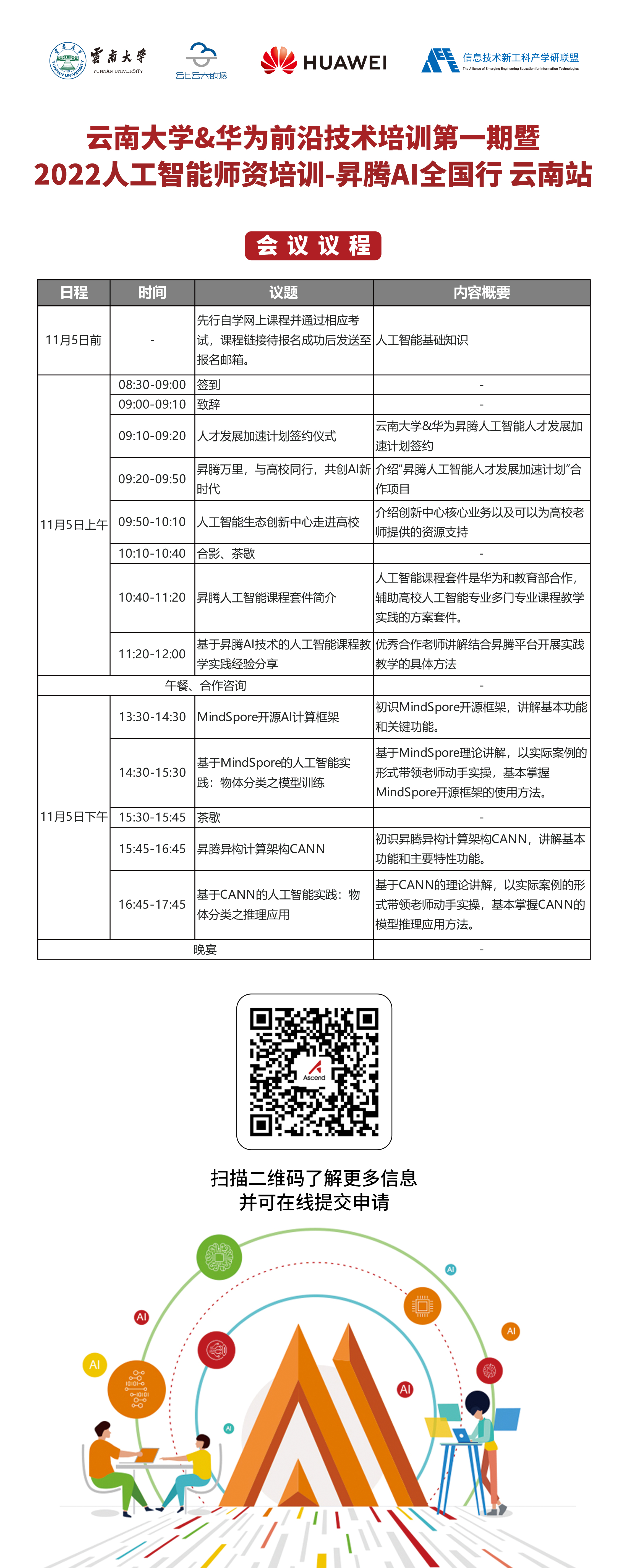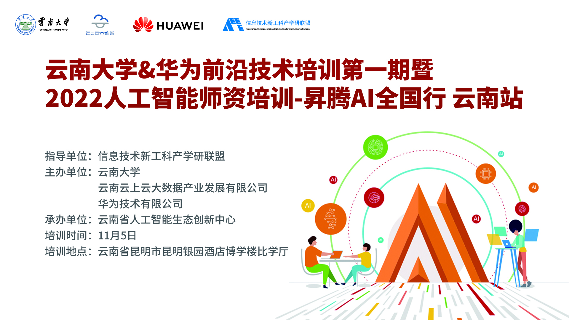 喜迎yl6809永利官网百年校庆,yl6809永利官网育人兴校系列活动,yl6809永利官网&华为前沿技术培训第一期,人工智能专题教师培训将于2022年11月5日(周六)举行,地点:云南省昆明市昆明银园酒店(老干部活动中心)博学楼比学厅,诚邀各位老师参加!