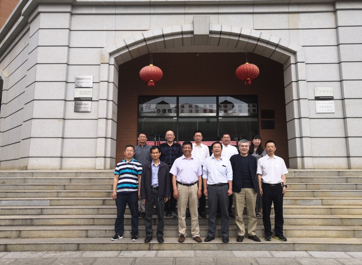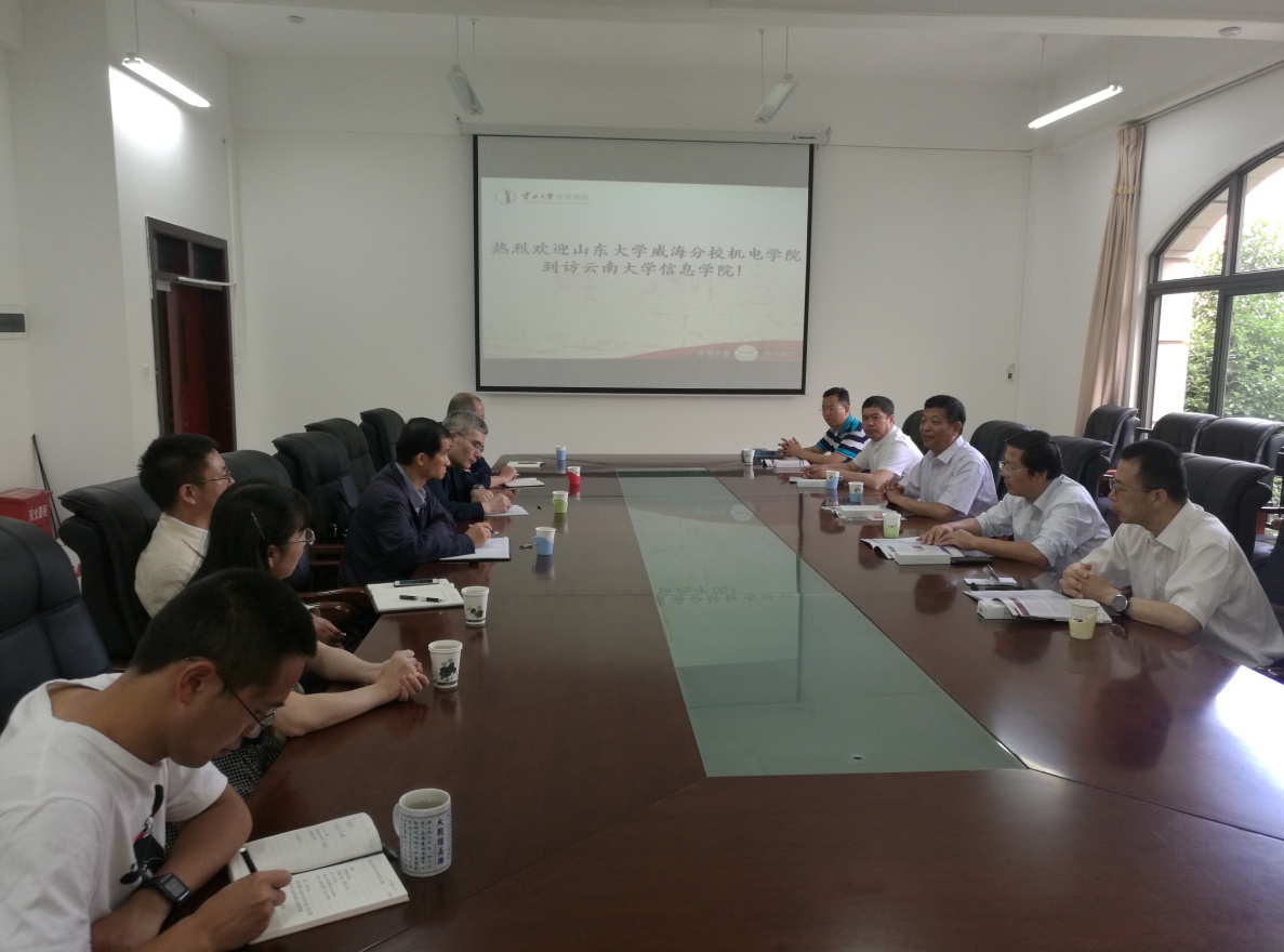 2018年6月19日上午9:30,山东大学威海校区机电与信息工程学院副院长潘景昌一行5人到yl6809永利官网进行交流访问。yl6809永利官网院长杨鉴教授、书记余江教授、副院长代红兵教授、副书记赵征鹏、控制工程学位点主任梁虹、计算机科学与技术学位点主任钱文华、党政办主任谭明川参加了会议。