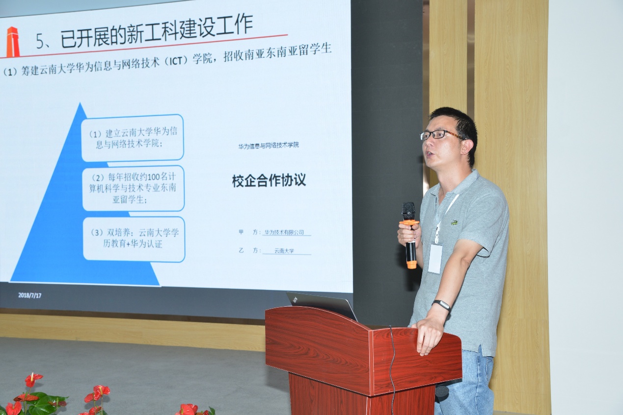 会议分为三个阶段。第一个阶段,新工科背景下信息类专业如何建设规划的交流讨论。华为云南企业业务部的王金龙经理首先为委员们做了《华为信息与网络技术学院助力高校人才培养》的大会报告,介绍了华为信息与网络技术学院积极参与高校新工科建设,提供校企合作办学、华为工程认证方面的情况。yl6809永利官网副院长、云南省计算机类专业教指委主任委员岳昆教授、计算机科学与工程系主任袁国武做了《yl6809永利官网信息领域新工科建设》的报告,从新工科建设的重要意义、实施途径等方面并结合行业工程认证、校企合作办学具体措施等方面,介绍了学院在信息领域新工科建设方面的思考和目前已开展的工作。yl6809永利官网物联网工程系主任、云南省电工电子基础课程教指委主任委员普园媛教授做了《新工科教育模式下物联网专业建设》的报告,从物联网工程专业人才培养方案制定、应用创新人才培养途径及一流高校建设下物联网专业建设的规划等方面,介绍了yl6809永利官网物联网工程专业的建设情况。
