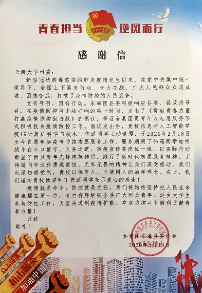 丁伟遥同学的行动受到了社会的高度肯定,近日,共青团东海县委向学校和团委发来感谢信。信中指出,我院青年学子在疫情面前无畏艰险,主动请缨,用汗水、勇敢、爱心和不变的初心,积极配合东海县开展防疫工作。与此同时,共青团东海县委对学校、学院以德育人、立德树人的实在成效给予了高度评价。