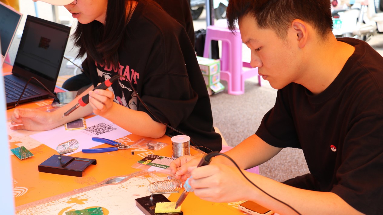 此外,汇展现场还设有“电路焊接体验”、“汉诺塔积木”、“图形化编程”、等互动游戏,供师生参与体验。参观过程中,师生们其乐融融,共同沉浸在这场科技盛会的氛围中。